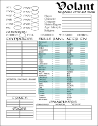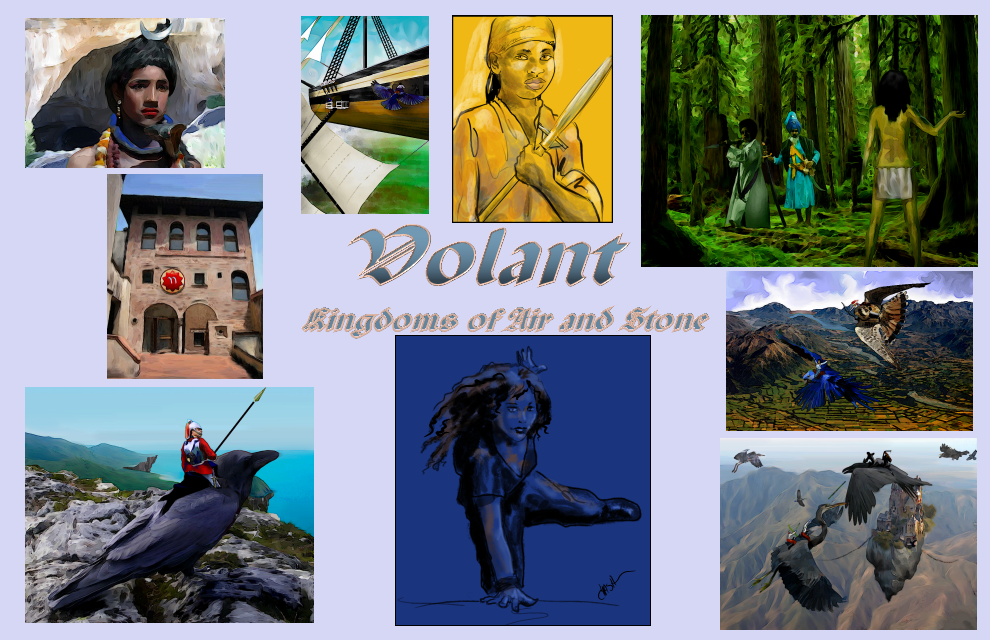 | Volant is set in a world of flying mountains called Skylands, on which civilization has recreated itself after a war between wizards let loose a flood of monsters to occupy the lands below. Humans ride giant birds into combat, and sail great skyships hewn from the floating stone that underlies their skylands. The only magic is Alchemy, which creates potions and powders from the magical plants and monsters of the surface. Wild human tribes live on the surface, skulking about in hiding from the horrible creatures which hunt them.