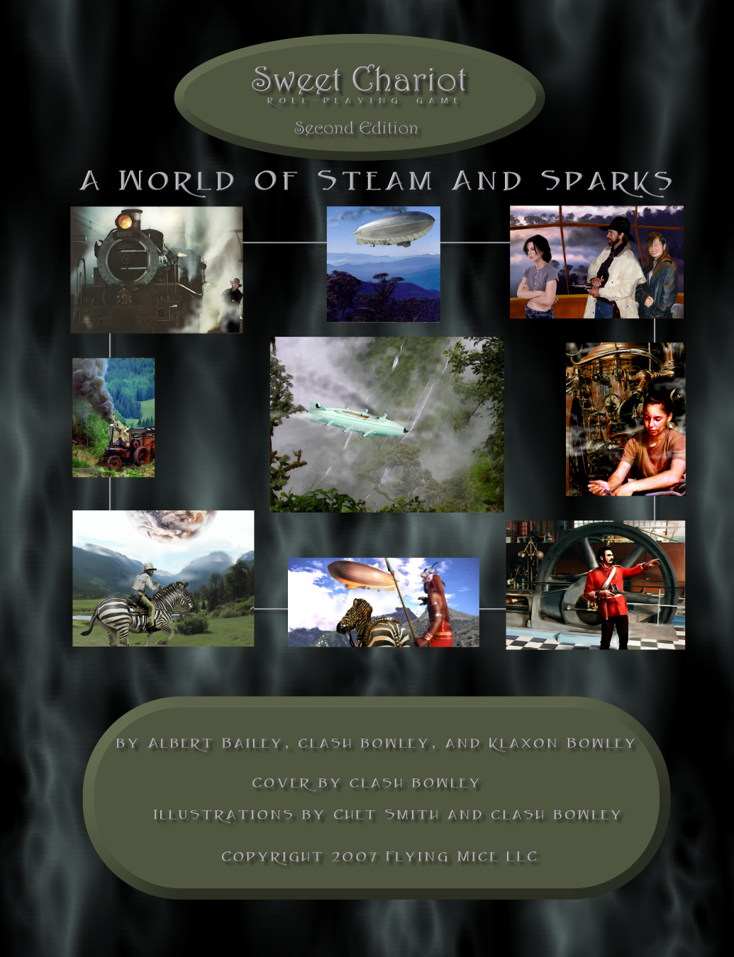 The oldest Diasporan-settled world in StarCluster, Chariot was colonized when treachery was overcome by determination. Working within the limits of a hostile world, the Charioteers slowly overcame the natural obstacles in their path, and their culture now is based on steam and natural nuclear fission. The many scattered nations of Chariot are united only by the steam dirigibles that fly over the deadly Deathlands for trade and conquest. Sweet Chariot is a single book containing everything needed to run a campaign on Chariot, and is interoperable with all StarCluster products. Sweet Chariot 2nd Edition uses the StarCluster/StarPool dice pool system also used in Blood Games II. You can use Sweet Chariot 2nd Edition with the StarCluster 2 percentile system as well, if you prefer. We felt that the StarPool version gave a more "pulpy" feel to the game. |